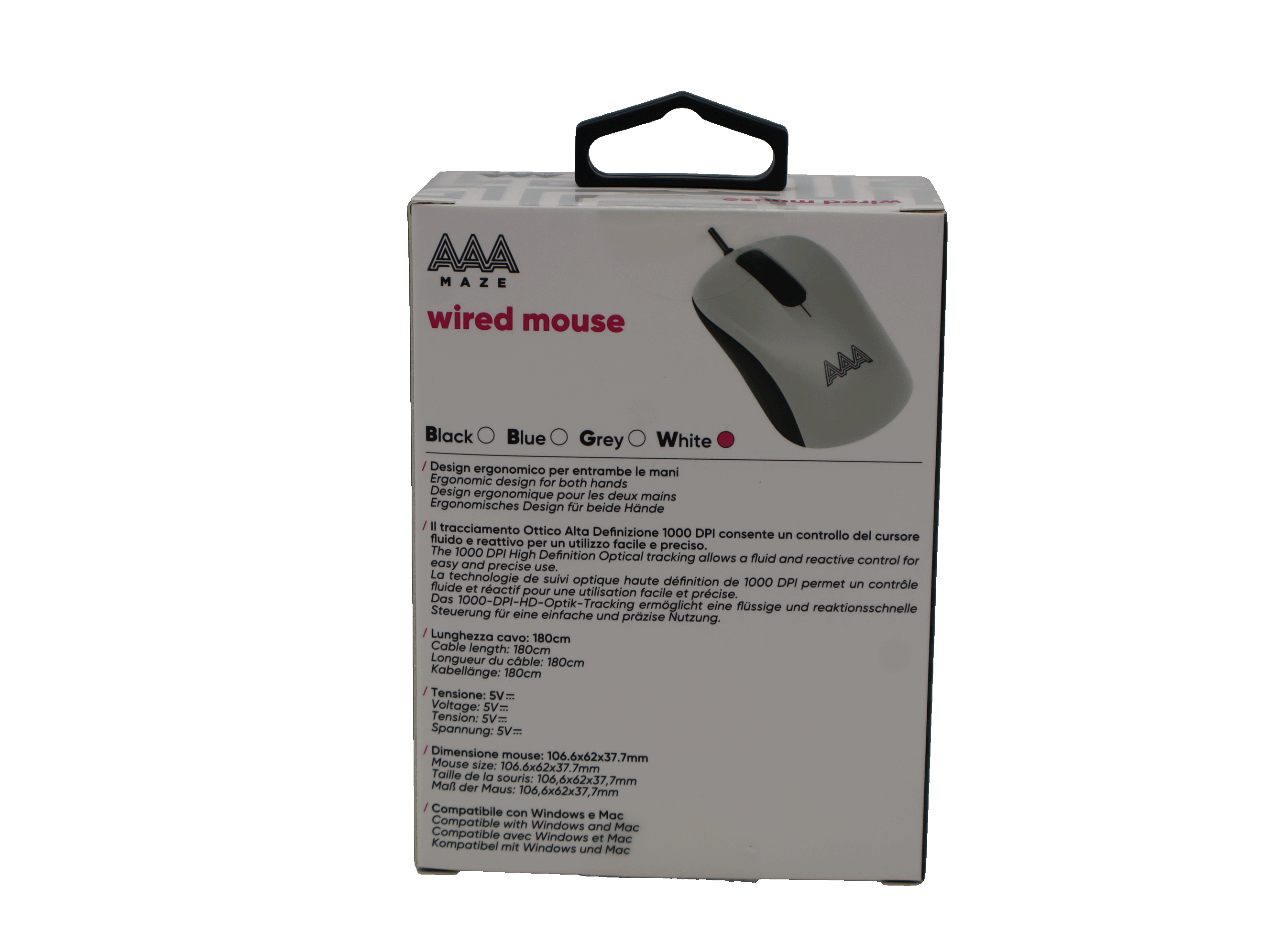– Dimensione mouse: 106,6 x 62 x 37,7 mm